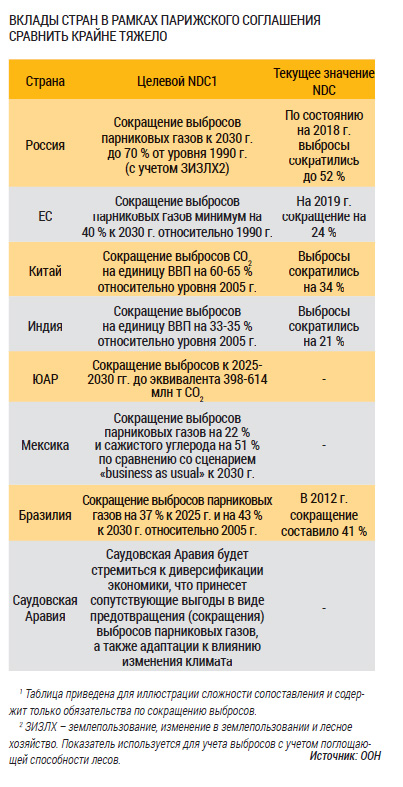 Таким образом, Парижское соглашение не устанавливает новых международных экологических ограничений, но вписывает в международный контекст национальные меры по ограничению выбросов. Представленные в рамках одного документа, эти меры становятся предметом международного изучения, обсуждения и сравнения, а также служат ориентиром для заинтересованных деловых, некоммерческих и политических сообществ стран-подписантов.