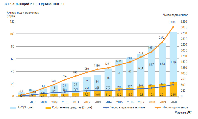 PRI – это поддерживаемое ООН объединение инвесторов, обязующихся вкладывать средства в соответствии с принципами ESG. На начало 2020 года число подписантов PRI выросло до более 3 тыс., а объем активов под их управлением составил более $103 трлн по сравнению с $59 трлн в 2015 г. В сентябре 2020 года число подписантов превысило 3,5 тыс.