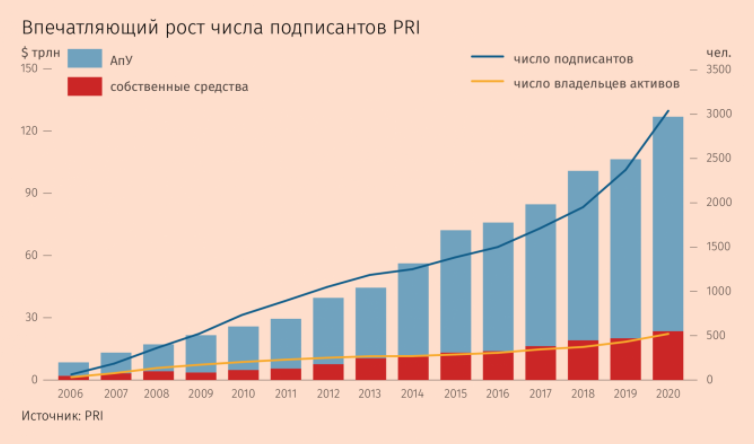 В структуре портфелей подписантов PRI облигации занимали ~40%, исходя из последних доступных данных за 2017 г. Если предположить, что их доля принципиально не изменилась, то получается, что при управлении портфелями облигаций на ~$20 трлн управляющие вынуждены проводить оценку на соответствие эмитента или выпуска критериям ESG.